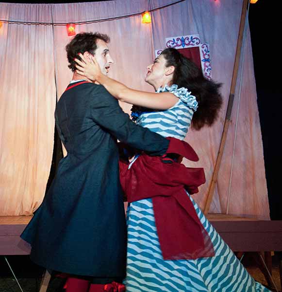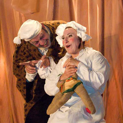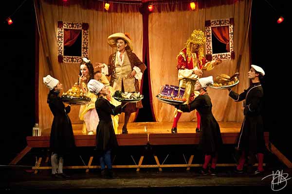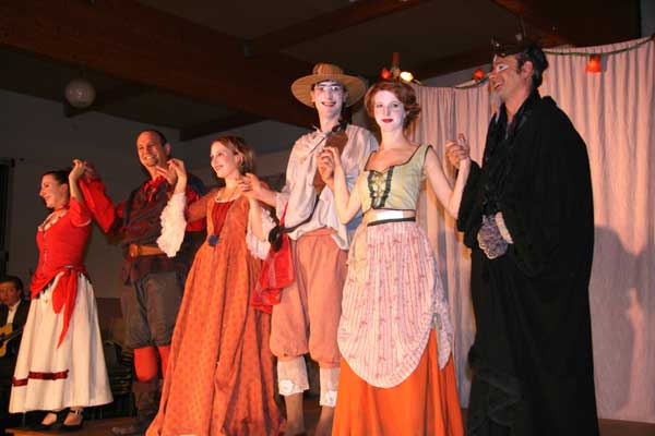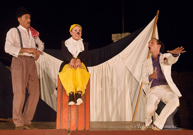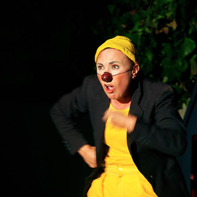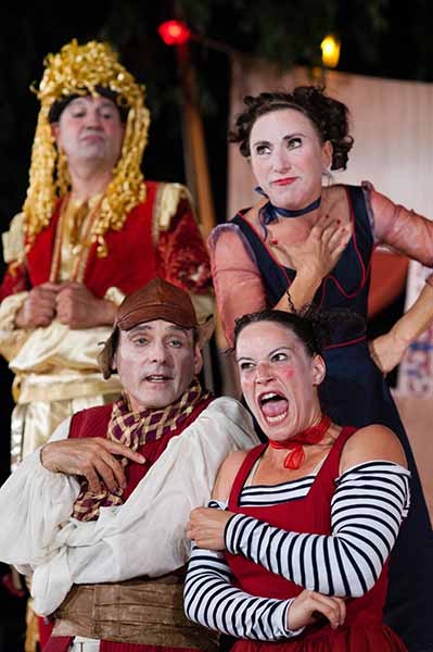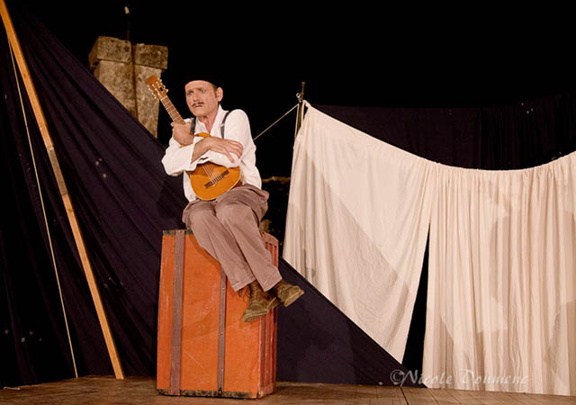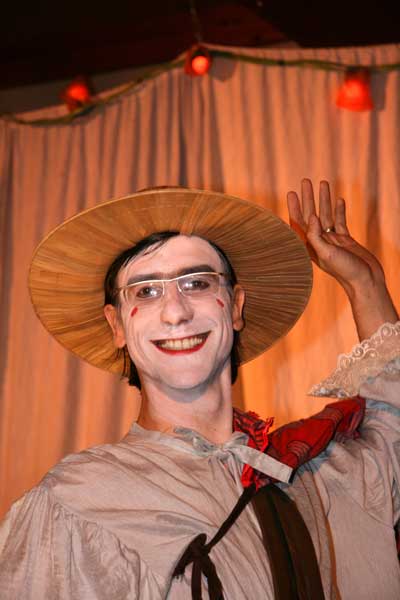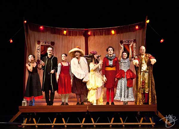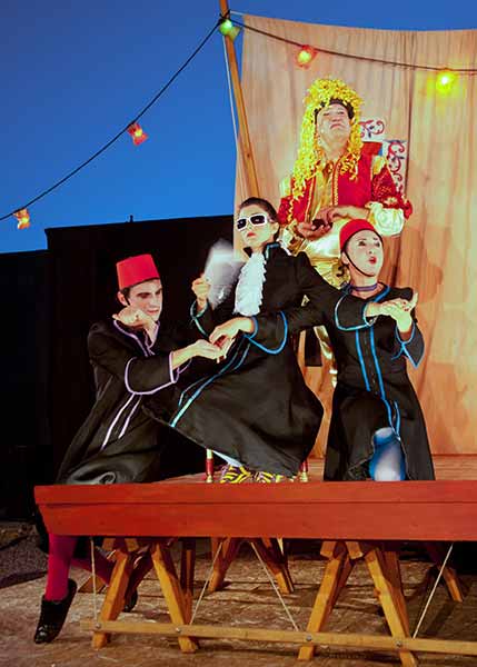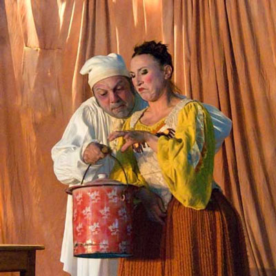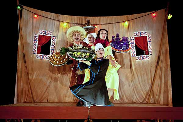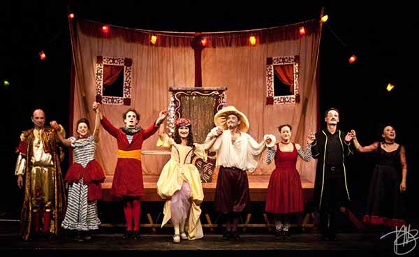 Un spectacle sur tréteaux pour comédiens, clowns, artiste de cirque, chanteuse et musicien.